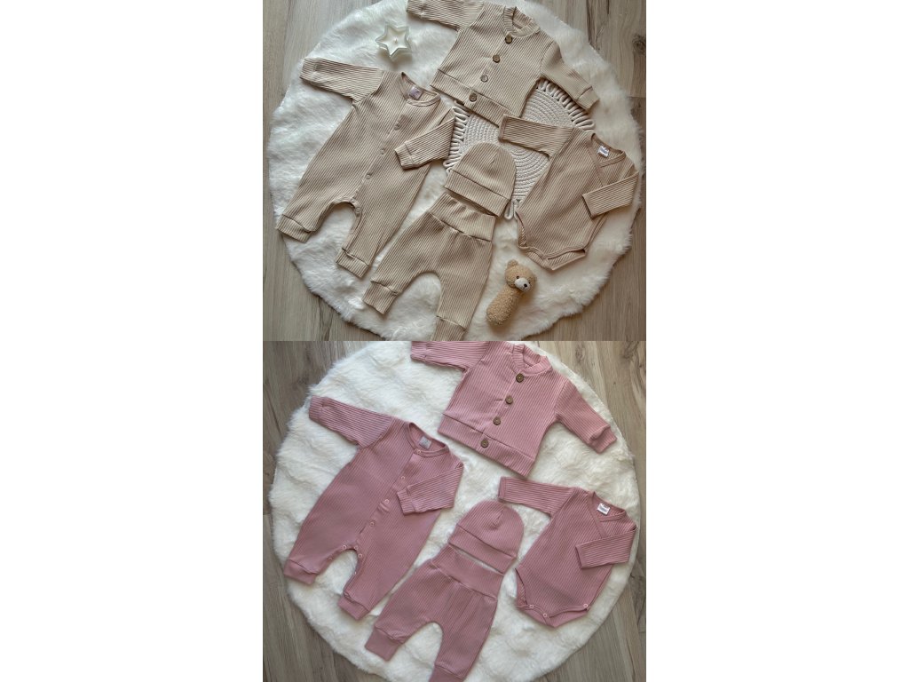 Set obsahuje zavinovacie body, pyžamá so zapínaním na cvoky, pohodlné tepláky, mikiny s gombíkmi a jemné čiapky, všetko farebne zladené a navrhnuté tak, aby sa jednotlivé kúsky dali jednoducho kombinovať. Farebné odtiene Pure Sand a Dusty Rose sú nadčasové, jemné a obľúbené najmä pre dievčatká.