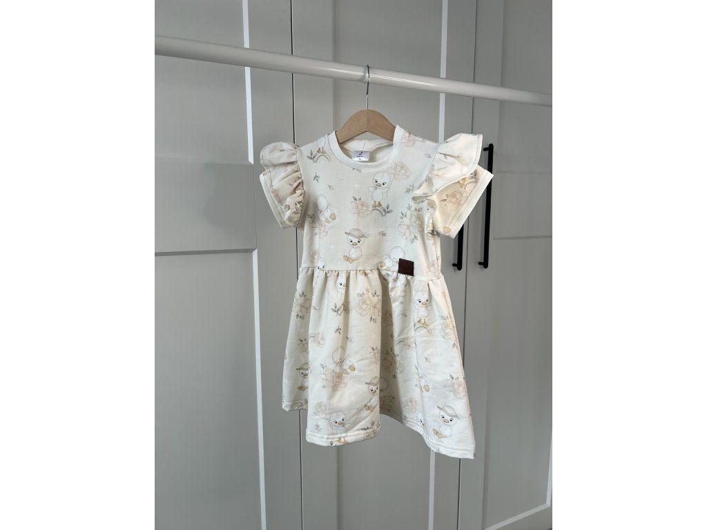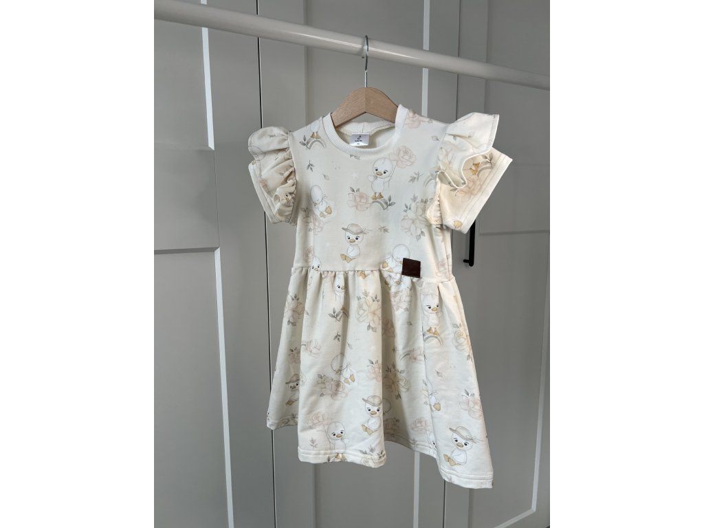 Dievčenské šaty majú pohodlný strih so zberanou sukňou, ktorá dodáva šatám jemný a elegantný vzhľad. Krátke rukávy s riasením pôsobia štýlovo a zároveň zabezpečujú komfort počas nosenia. Roztomilý vzor kačičiek robí zo šiat obľúbený kúsok v detskom šatníku.