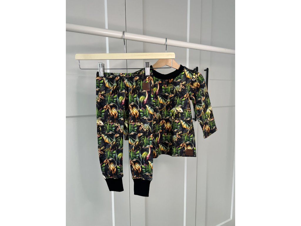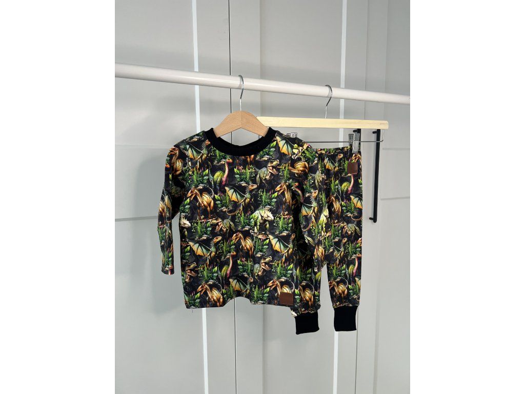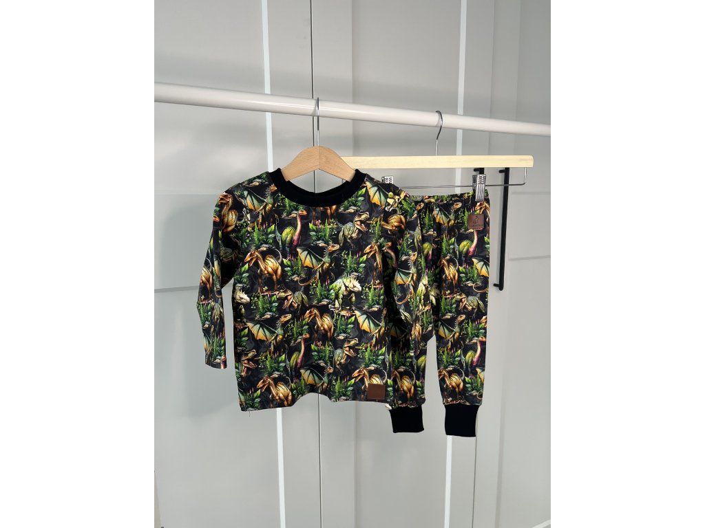 Štýlová detská súprava s dinosaurovým motívom je perfektnou voľbou pre malých dobrodruhov. Set pozostáva z pohodlného trička s dlhým rukávom a nohavíc, ktoré spolu vytvárajú praktický outfit na každý deň – do škôlky, na ihrisko aj domov.