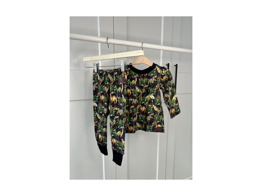 Tričko má pohodlný strih a príjemný materiál, zatiaľ čo nohavice sú vybavené elastickým pásom, ktorý dobre drží a netlačí. Výrazný dinosaurový vzor dodáva súprave hravý a jedinečný vzhľad, ktorý si deti zamilujú.