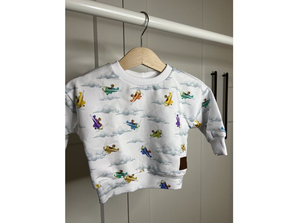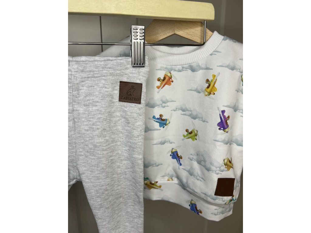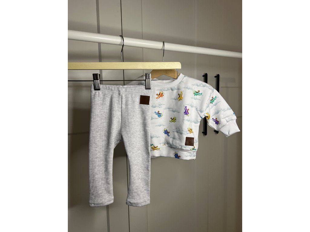 Roztomilá detská súprava s motívom lietadiel je ideálnou voľbou pre malých objaviteľov. Set pozostáva z pohodlnej mikiny s dlhým rukávom a legín, ktoré spolu vytvárajú praktický outfit na každý deň.