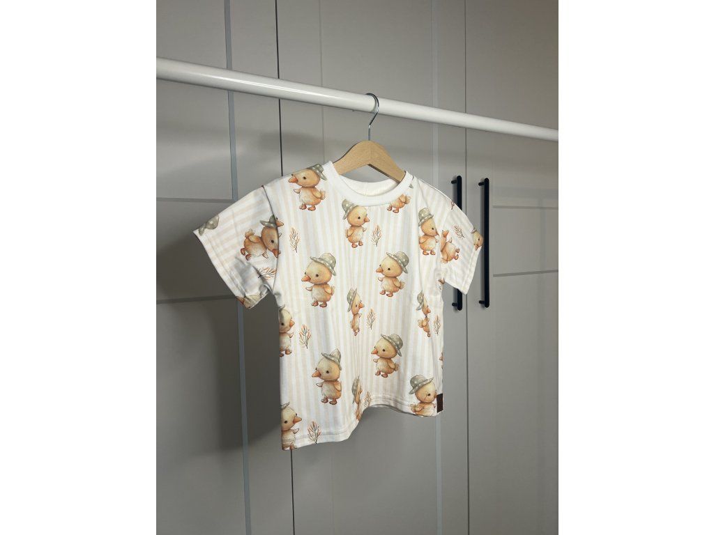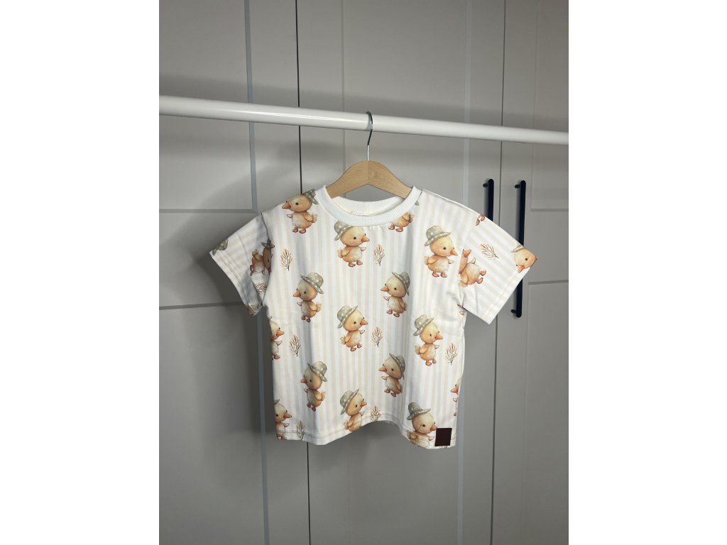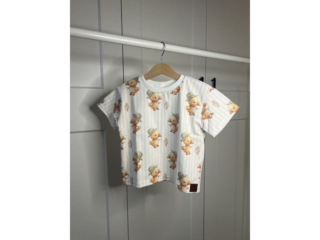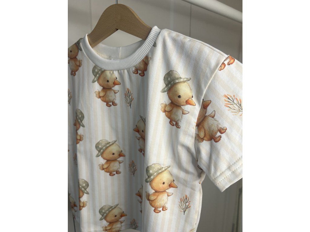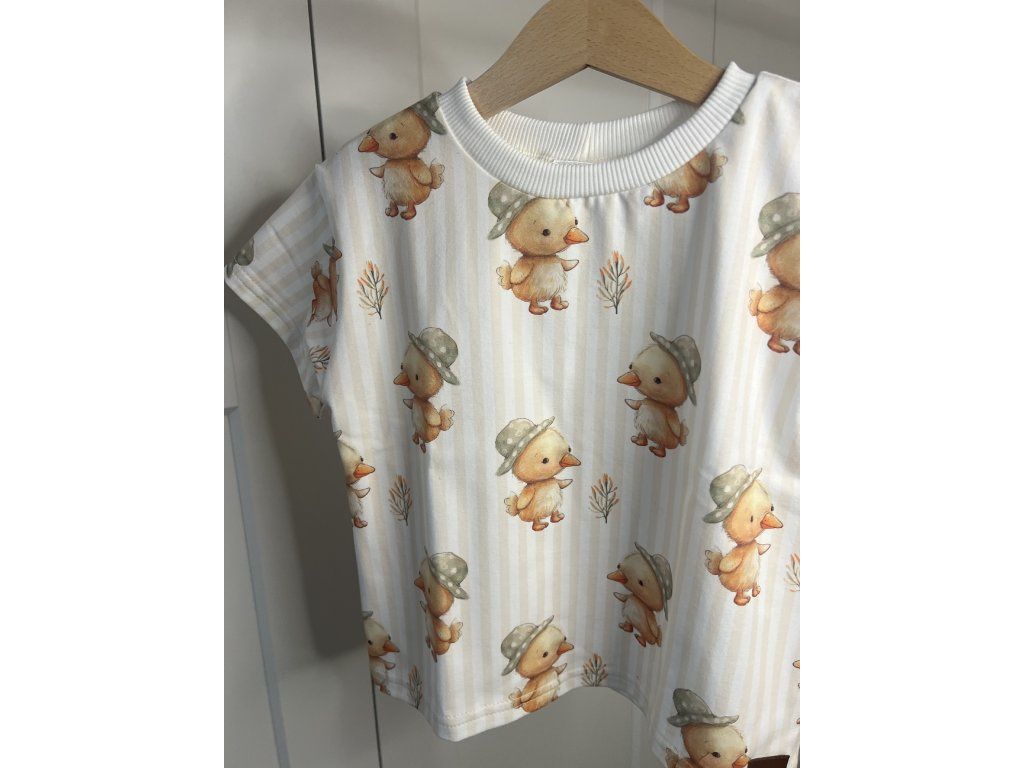 Krátke rukávy a pohodlný strih zabezpečujú maximálnu voľnosť pohybu počas celého dňa. Jemný vzor kačičiek pôsobí hravo a zároveň štýlovo, vďaka čomu sa tričko ľahko kombinuje s legínami, teplákmi alebo kraťasmi.
